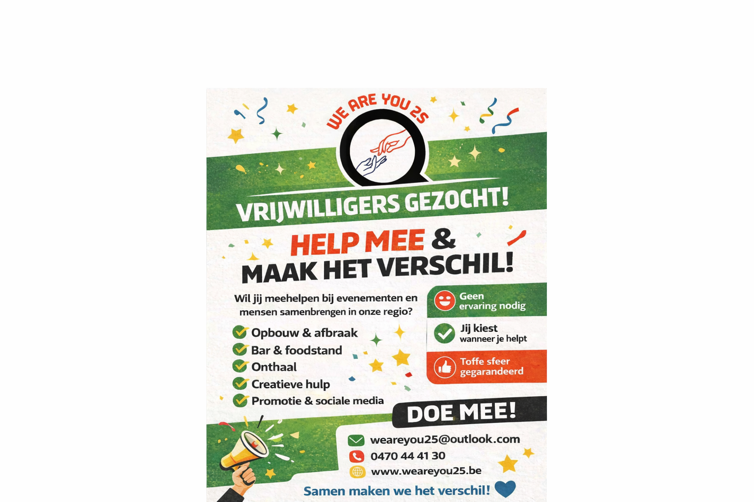 Bent u iemand die dezelfde gedrevenheid en het enthousiasme deelt om actief mee te werken aan dit bijzondere project? Bij 'we are you25' zijn we ervan overtuigd dat de kracht van samenwerking en het delen van onze passie de sleutel is tot succes. Ontdek hoe u onderdeel kunt worden van onze warme en liefdevolle gemeenschap en samen met ons een betekenisvol verschil kunt maken in de wereld om ons heen.